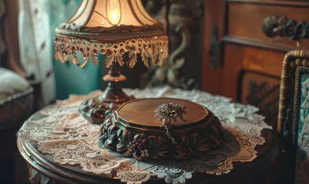 A vintage wooden interior with floral carvings and lamp