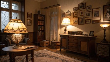 Soft lighting cast by retro lamps creating an ambiance that enhances the inviting nature of the nostalgic room..