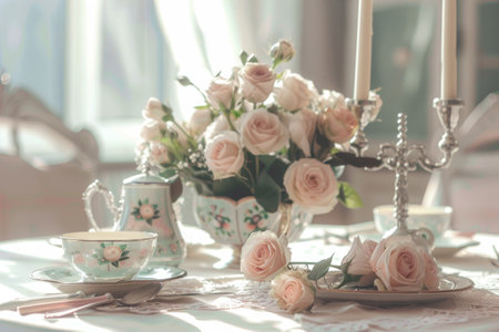 A table with a tea set and flowers. The flowers are pink and arranged in a vase. The tea set includes a teapot, cups, and a spoon