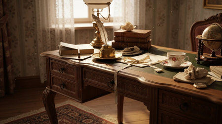 An ornate vintage wooden desk is depicted with a desk lamp casting a warm glow. Several books are stacked, alongside an open book and crumpled papers. An inkwell with a feather quill, a teacup and saucer, and a vintage globe are also present. The scene is set near a window with lace curtains, and sunlight filters through, highlighting the rich details of the furniture and
