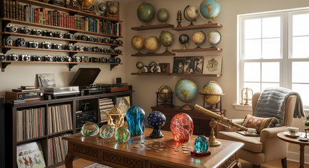 A warm and cozy room is filled with extensive collections, including shelves of vintage cameras, world globes, and vinyl records. This personal study or library space reflects a passion for travel, photography, and antique hobbies.
