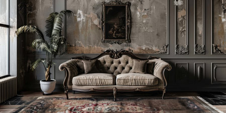 This captivating vintage interior showcases an eclectic mix of antique furniture and unique wall art, creating a cozy and inviting atmosphere perfect for any space.