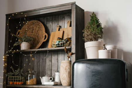 Christmas decor in the stllovaya or kitchen. Cupboard with dishes and spruce or fir branches in a basket