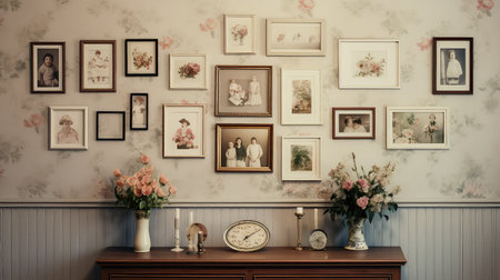 A charming vintage decor style showcases a wooden table adorned with picture frames and vibrant flowers, creating a cozy atmosphere filled with nostalgia.