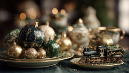 Vintage Christmas table setting with silver and gold ornaments. Selective focus.