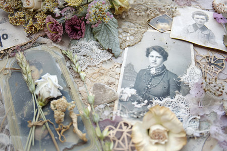 Old, vintage photographs rest on an antique table, creating a warm, nostalgic atmosphere perfect for antique shops or vintage studios.