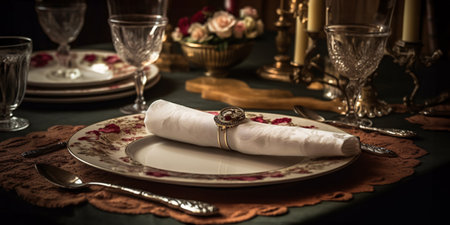 Luxury banquet table with ornate crockery, silverware, and crystal wineglass generated by artificial intelligence