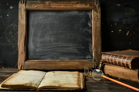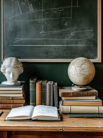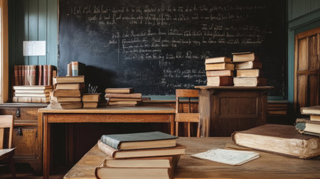 A nostalgic vintage classroom scene featuring stacked old books, wooden desks, and a chalkboard filled with handwritten notes, capturing the essence of traditional education and learning.