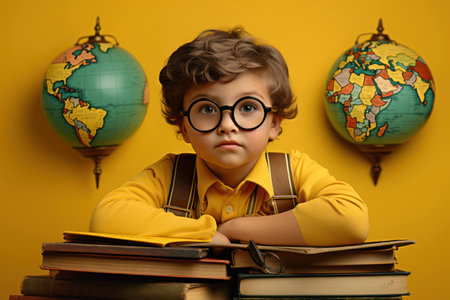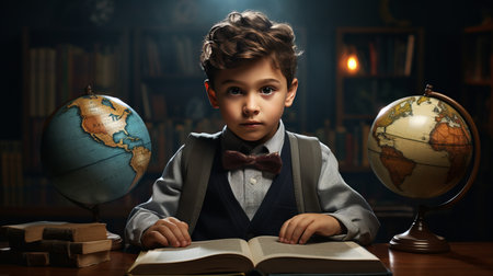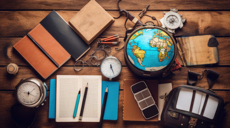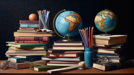 A creative workspace adorned with books, a globe, and a pen and pencil holder. Generative AI