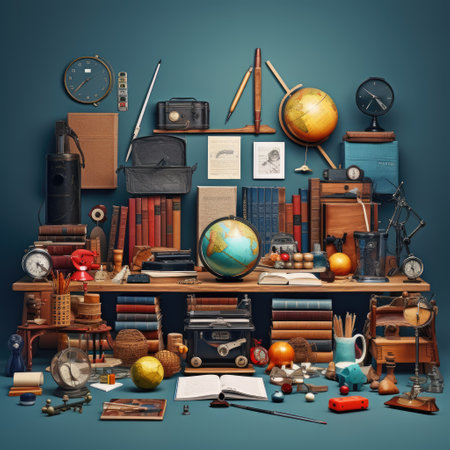 A cluttered desk covered in books and various other educational items, Different educational tools and materials scattered on a desk