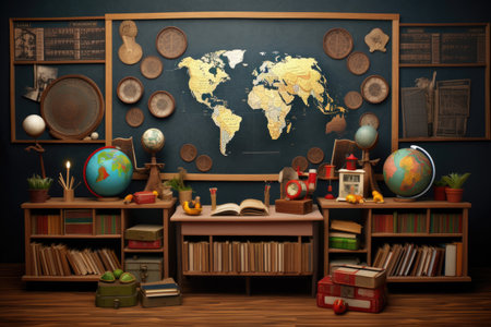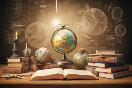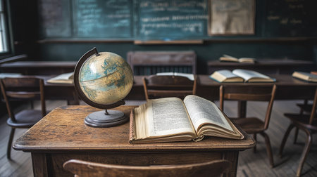 A vintage classroom scene featuring a globe and an open book on a wooden desk, showcasing a nostalgic educational environment with a blackboard backdrop.