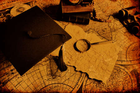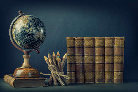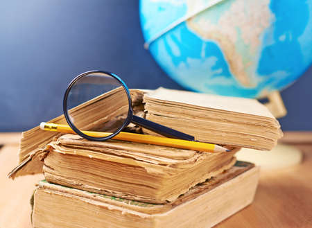 Studying geography composition of a stack of old books, pencil and magnifying glass against the background of the globe and blackboard