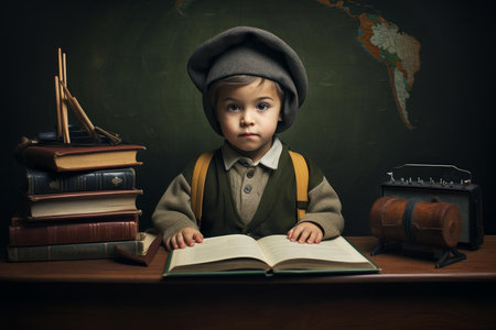 Young child poses with books, a globe, and an old-fashioned typewriter on an antique desk