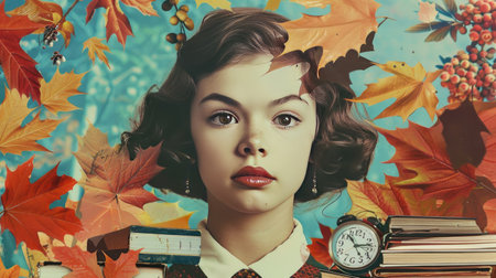 Autumn Portrait of a Young Girl Amidst Falling Leaves and Books