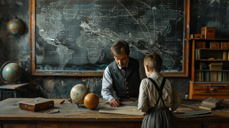 Vintage Classroom Lesson: Teacher and Student in Historical Study with Maps and Globes