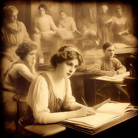 A captivating vintage classroom scene featuring wooden furniture, a chalkboard filled with writings, and traditional decor, perfect for themes of education and nostalgia.