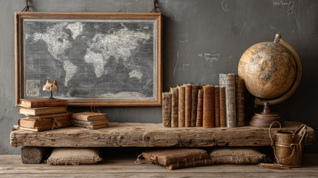 A beautifully arranged rustic wooden shelf featuring a vintage world map, antique books, an educational globe, and charming decor elements. Perfect for study.