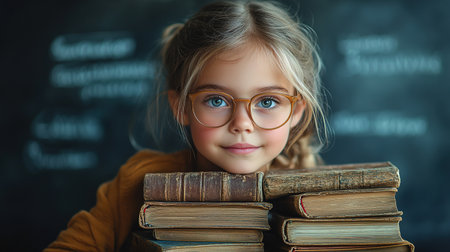 Pile of aged books on a rustic wooden table, with a chalkboard and math formulas in the background, space for copy.