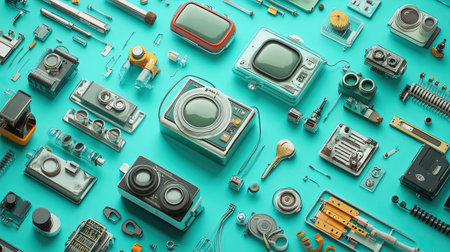 A vibrant collection of vintage electronics, circuit boards, and gadgets arranged creatively against a white backdrop. Perfect for technology enthusiasts.