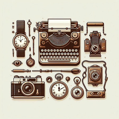 Vintage typewriter, camera, wristwatch and other vintage equipment. Vector illustration.