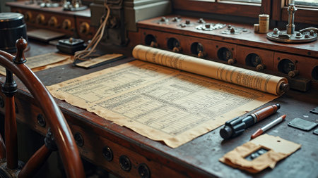 Vintage nautical instruments and navigation chart on ship's bridge. That the image is generated using AI.