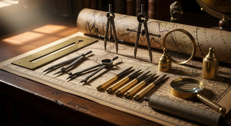 Vintage maritime navigation instruments on nautical map.