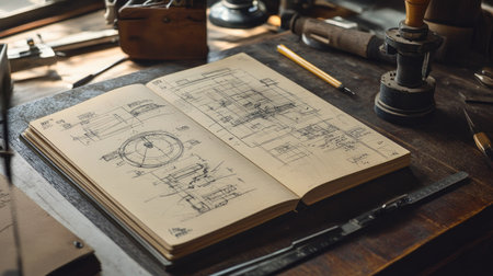 A close-up of an engineers notebook, filled with sketches and technical diagrams, with a drafting table and tools nearby.