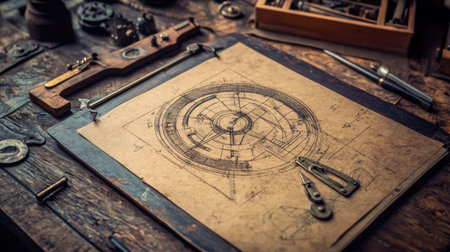 A beautifully crafted scene capturing vintage workshop tools alongside a detailed technical drawing on a wooden workbench, showcasing artistry and craftsmanship.