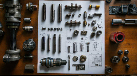 Industrial machine parts including shafts, pistons, and bolts beside measurement instruments and blueprints