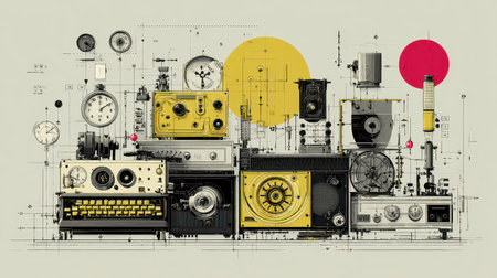 This detailed vintage machinery illustration combines graphic design elements in a unique layout. The composition features intricate tools and gauges, set against a creative backdrop.