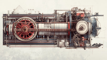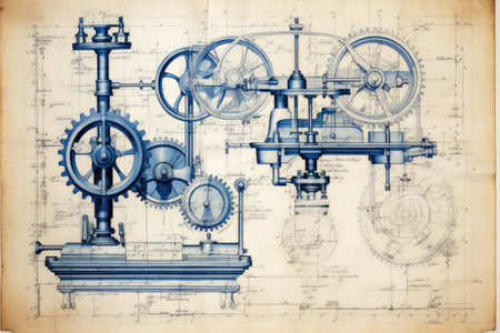 Explore a detailed illustration of vintage machinery with intricate components and blueprint elements, showcasing the blend of art and technology in engineering design.