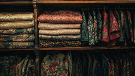 Stacked vintage textiles with rich floral patterns arranged neatly on wooden shelves, creating a warm and nostalgic atmosphere.
