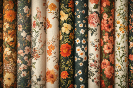 Fabric rolls showcasing diverse floral patterns, ideal for crafts, fashion, or interior design