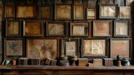 Vintage frames with old photographs on a wooden wall, nostalgic home decor.