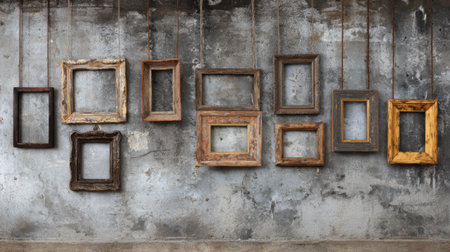 Unique Vintage Frames Adorning Grungy Wall for Stunning Art or Photography Display. Concept Vintage Frames, Grungy Wall, Art Display, Photography, Unique Decor