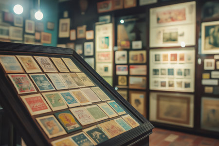 Vintage stamps displayed in wooden frame in museum or exhibition, collection of old postage stamps from different countries and times
