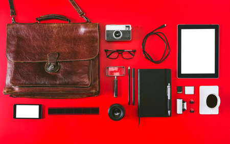 Cropped shot of digital devices with camera, smartphone, tablet, stationery and accessories on dark table
