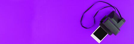 Instant photo frame and camera on a violet background. Concept of preservation of memories. Flat lay. Copy space. Banner.