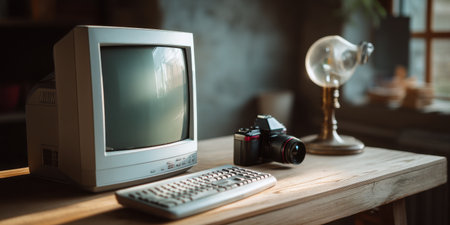 Vintage computer monitor and keyboard on wooden table with camera and lamp in cozy room