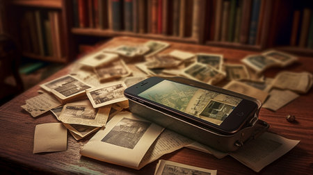 Old vintage books and smartphone on a wooden table : Generative AI