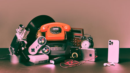 Various vintage and modern gadgets are arranged on a wooden table, highlighting the evolution of technology. Items include cameras, telephones, and portable devices.