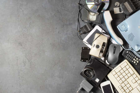 Old electronic devices on a dark background. The concept of recycling and disposal of electronic waste. Copy space