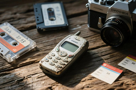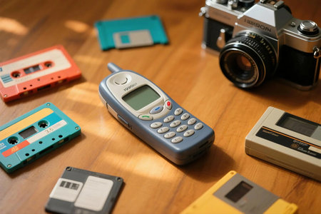A nostalgic flat lay featuring an old mobile phone, retro cassette tapes, and a vintage film camera on aged wood. Perfect for retro tech, analog media, or nostalgia themed designs.