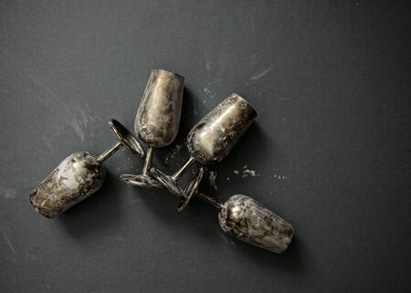 Top view of various dirty and with lime dots drinking glasses placed upside down on black matte background