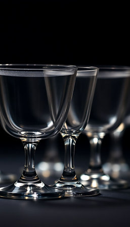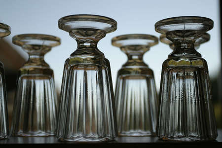 Row of glasses macro shot. Empty glasses on a banquet table close up