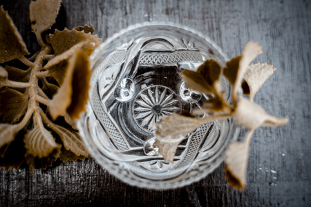 Ajwain water or carom extract or bishop's weed water in a bowl with raw ajwain or oomam leaves on wooden surface.