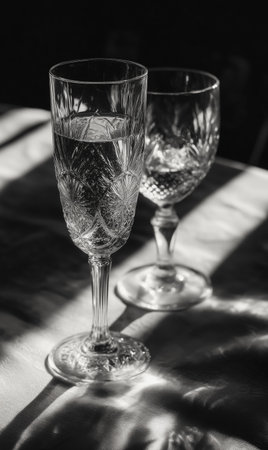 Two crystal glasses with intricate designs are placed on a surface casting delicate shadows as sunlight streams in.