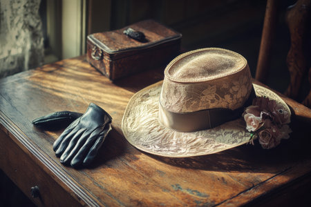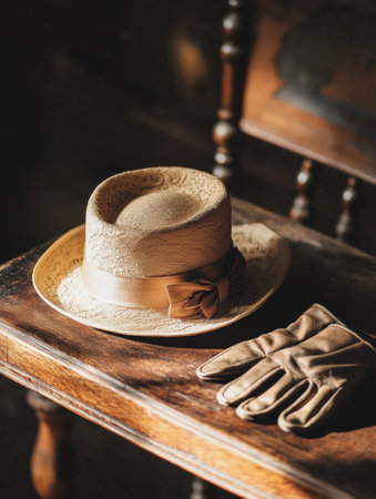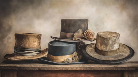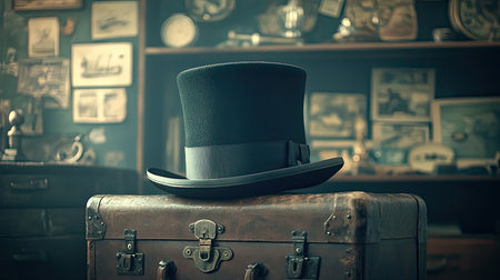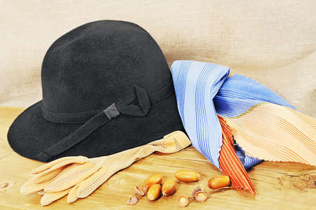 Hat, high inverted cylinder and decorative beads on a white background. Imitation of old pictures. Retro.