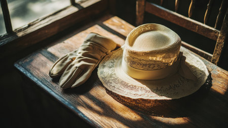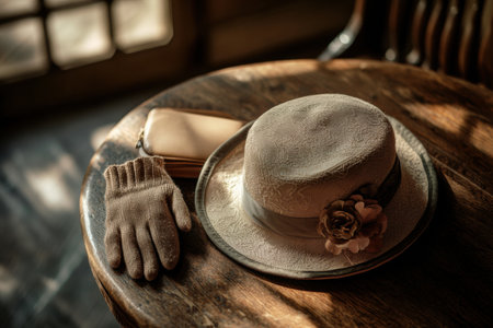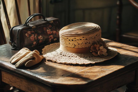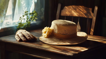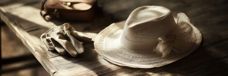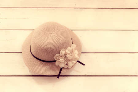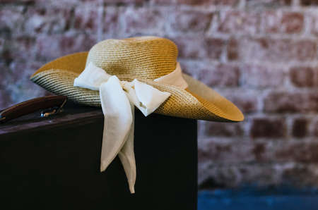 Hat on the table. Straw lady's hat with a black ribbon. Concept of rest and vacation. Table in a park cafe. Sunny hot weather.