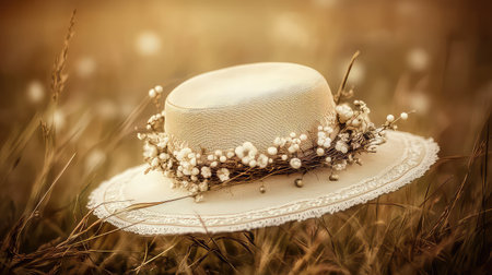 Straw hat with red piping and dry flowers as a symbol of summer and relaxation